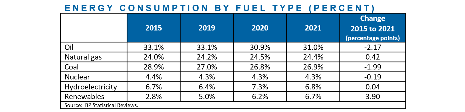 Since the 2015 Paris Agreement, total global energy consumed has risen by almost 7%. Except for a handful of countries, jurisdictions around the world have increased their total primary energy consumption. Those that managed to achieve reductions did so by rather miniscule amounts. Of course, rising energy demand is not unexpected given the links between energy use, population, and economic growth. Our guess is that in 2022, total global energy consumed will be at least the same as in 2021, if not larger, even with current inflationary pressures and the other extraordinary global events in the last several months.