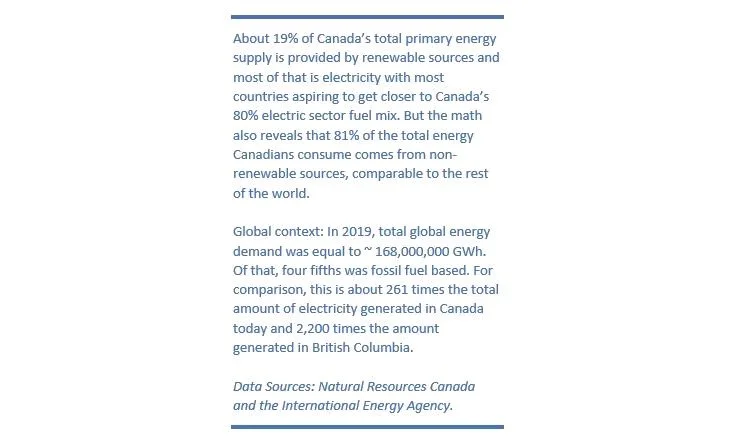 The size of the economy-wide energy transformation to non-GHG emissions sources is so big it is difficult to imagine. The easiest way to see this is to look at known, recently completed, or under construction large hydroelectric projects — Site C here in B.C. at 1.1 GW and 5,100 GWh per year, Muskrat Falls in Newfoundland at 0.824 GW and 4,900 GWh per year, and Keeysak in Manitoba at 0.695 GW and 4,400 GWh per year. In 2019, to bridge the ~2,600,000 GWh[2]difference in required energy flows to achieve 100% electrification of the entire energy system, Canada would have needed the equivalent of an additional 508 Site C’s, 529 Muskrat Falls, 589 Keeysak projects, or 133 Darlington[3]nuclear generation facilities to be in operation! Going forward this gap will widen because of future population and economic growth.