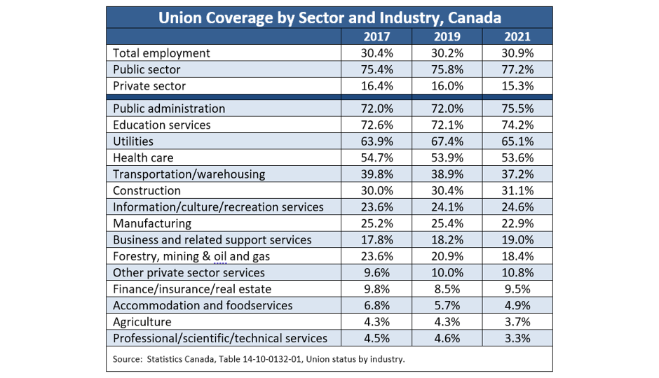 As for specific industries, union coverage is highest in public administration, education, the utilities sector, and health care and lowest in agriculture, professional/scientific/technical services (which includes some segments of the advanced high technology sector), and accommodation and foodservices. There have been few significant shifts in unionization rates since 2017 within the industries listed in Table 1, although non-trivial declines were registered in manufacturing, forestry/mining/oil & gas, accommodation and foodservices and transportation/warehousing while the already heavily unionized education sector saw a further increase in coverage.