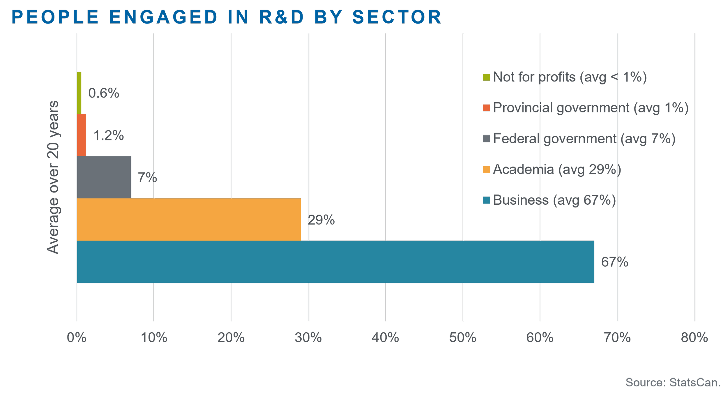 It’s the beginning of yet another year, and there are at least two key things we should worry about — our collective prosperity and its importance for citizen well-being. From a policy perspective, without the former, the latter is unattainable. Continued inflation for consumers and the cumulative impact of tax and fee increases on everything from greenhouse gases to employment and retirement funds over the past years are taking a hammer to Canadians’ standard of living. So, in the words of my colleagues, we must work smarter — not harder. [1] It is not a leap to understand that getting things built in our most economically productive sectors — including high-quality infrastructure that facilitates the movement of goods and enables trade and commerce — is critical to advancing our collective prosperity. As a small open trading economy, Canada and B.C. are places where exports lead to a general increase in economic activity [2] and well-paying jobs by leveraging our existing comparative advantages. [3] The prized outcomes of innovation, new technology, and solutions to various challenges — including, for example, environmental ones — come in significant part from basic “first dollar” income generated by our trade-exposed sectors. This is true in part because business has the greatest number of people involved in innovation (Figure 1), a consistent number over the past 20 years despite flagging foreign investment [4] (Figure 2) and an increasing tendency of Canadians (and their pension funds) to invest outside of the country. But the bottom line is we are falling behind economically [5] and can only course-correct with some bold moves to get things built. Reforming today’s complex, costly, duplicative, and time-consuming regulatory processes is a good place to start. In an increasingly challenging and uncertain geopolitical context, it’s imperative.