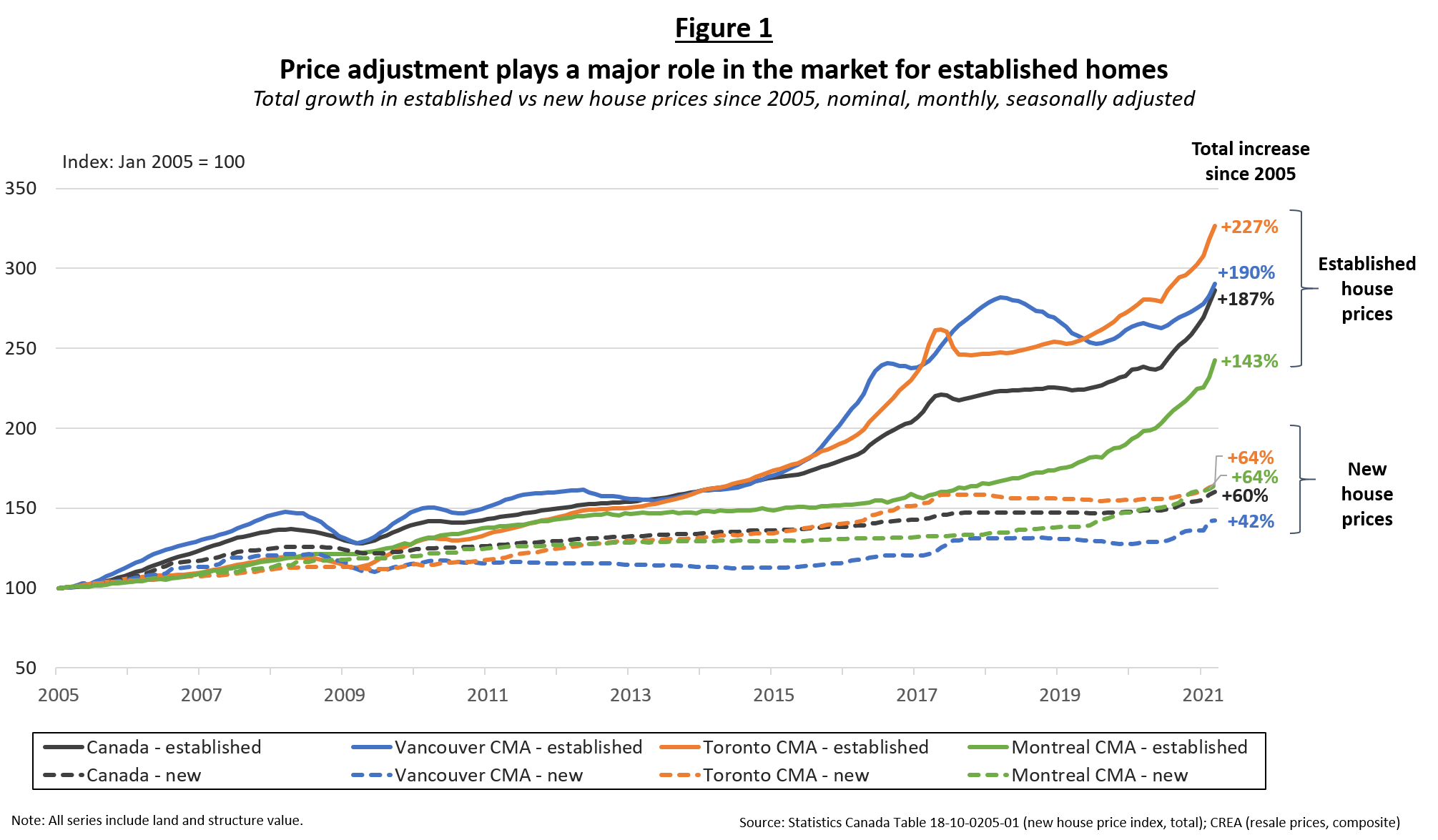 This blog will discuss why established and new house prices behave differently, especially in Canada’s land-constrained gateway cities. Figure 1 shows that since 2005 established house prices have risen by a total of 227%, 190% and 143% in the Toronto, Vancouver, and Montreal CMAs, respectively. Over the same period, new house prices saw a cumulative increase of only 64% in the Toronto and Montreal CMAs, and by 42% in the Vancouver CMA. For Canada as a whole, average established house prices have risen by 187% since 2005, whilst new house prices have risen only 60% over the same period. All series are inclusive of land and structure values. There are good reasons for the huge disparity between established and new home price growth: their prices are determined very differently.